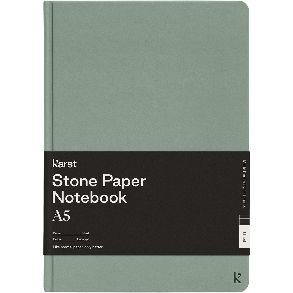 The Karst® A5 hardcover notebook is a bestseller and crowd pleaser. The smooth texture of the pages and flat-lay binding provide ample comfort and writing space for your notes and ideas. Features an elastic band to keep notebook shut, 144 waterproof, tear-resistant lined pages, an expandable back pocket for storage, and a divider ribbon with heat-sealed tip and rounded corners.